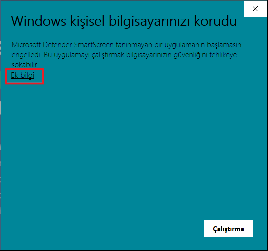 Bilgisayarınızın güvenlik önlemlerine bağlı olarak “Windows kişisel bilgisayarınızı korudu” ifadesi ile aşağıdaki uyarı penceresi ile karşılaşabilirsiniz.
