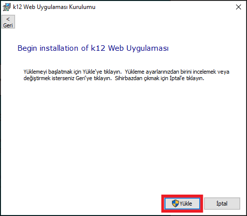 Karşınıza “k12 Web Uygulaması Kurulum” penceresi açılacak. “Yükle” butonuna tıklayarak kurulumu başlatabilirsiniz.