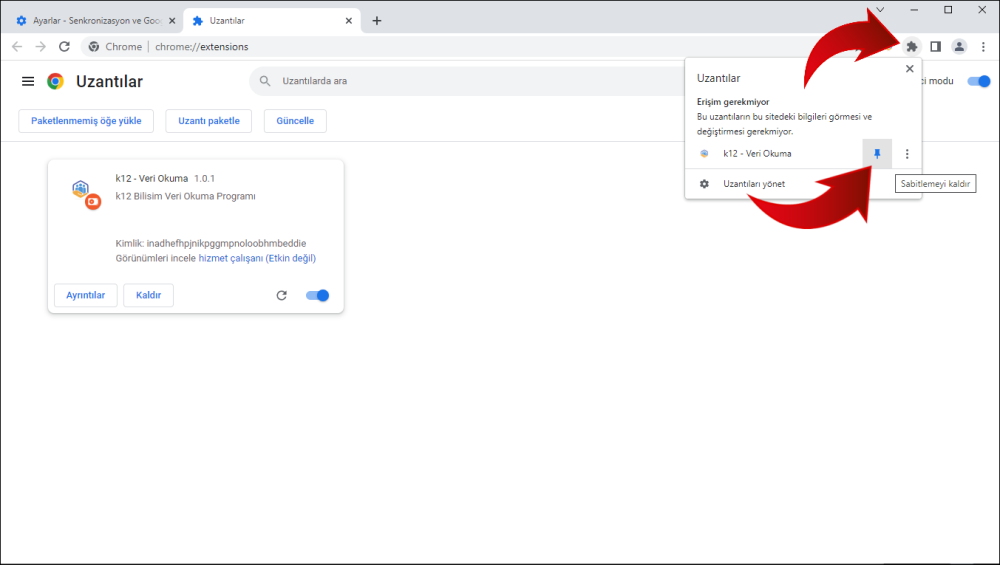 Eklentinin yanında bulunan “iğne” ikonuna tıkladığınızda uygulamayı tarayıcınızın araç çubuğuna sabitlemiş olursunuz. Bu sayede tarayıcıyı her açtığınızda k12 logosuna tıklayarak bu eklentiye kısayoldan erişebileceksiniz.