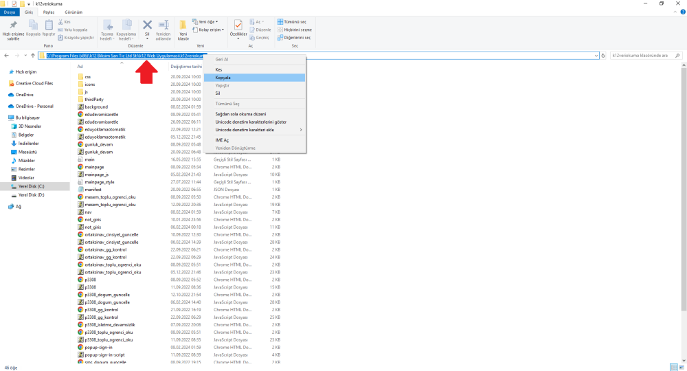 Yukarıdaki adres çubuğundaki adresin tamamını seçmelisiniz. Ardından seçtiğiniz alanın üzerinde mouse ile sağ tuşa tıklayarak “Kopyala” seçeneğini seçmelisiniz.