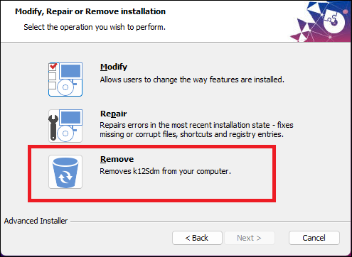 Akıllı Tahta Kontrol (Eski Ver.) uygulaması akıllı cihazınızda yüklüyse yeniden yüklemek yerine Modify (Değiştir)/Repair (Onar)/Remove (Kaldır) seçenekleri karşınıza çıkar. Bu seçeneklerden Remove (Kaldır) seçeneğini seçip pencerenin alt tarafında bulunan Next (İleri) butonuna tıklamalısınız.
