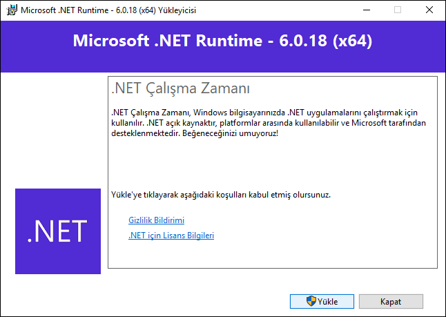 İkinci olarak açılan Microsoft .NET Runtime sayfasında da Yükle butonuna basarak devam ediyoruz.