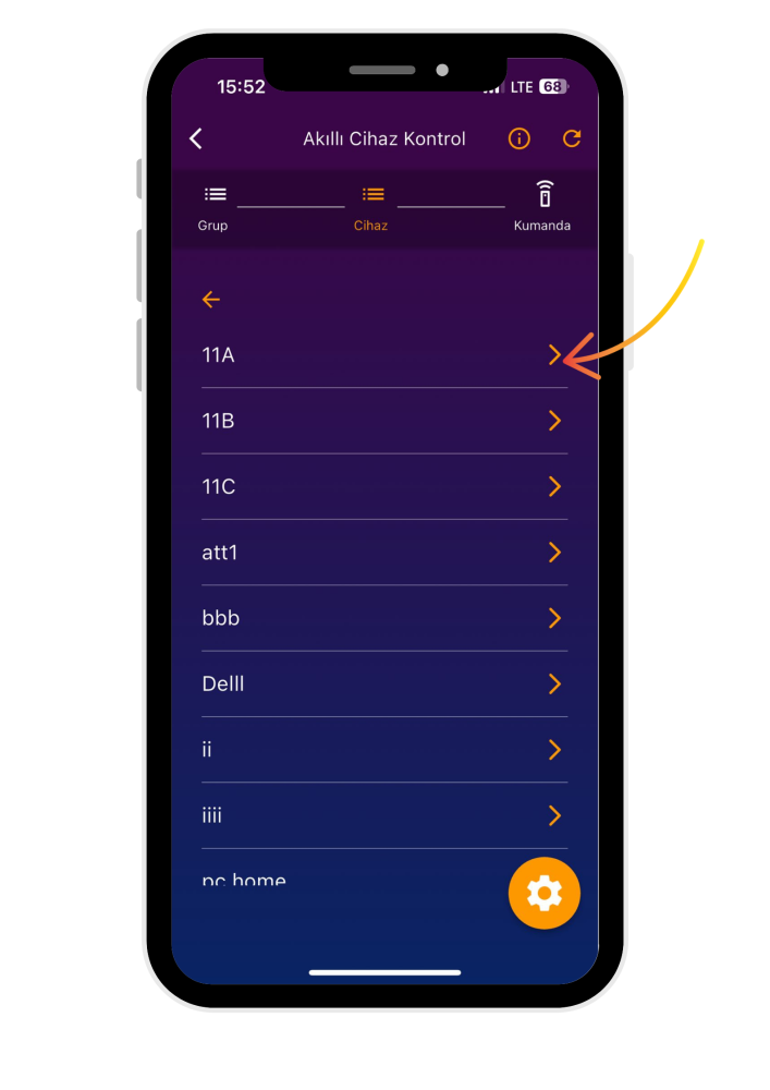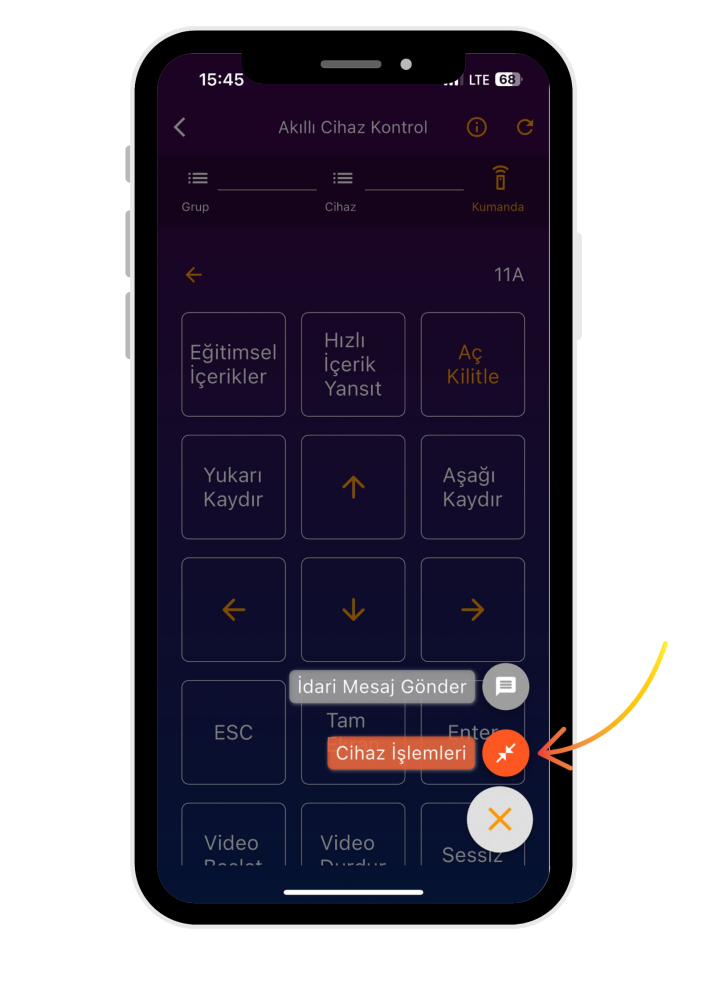 Akıllı cihazı dondurmak için Akıllı Cihaz Yönetimi modülünden Akıllı Cihaz Kontrol alt modülüne tıklıyoruz. Daha sonra işlem yapmak istediğimiz cihaz hangi grup içerisindeyse o grubu seçiyoruz. Seçtikten sonra cihazımızı seçiyoruz.