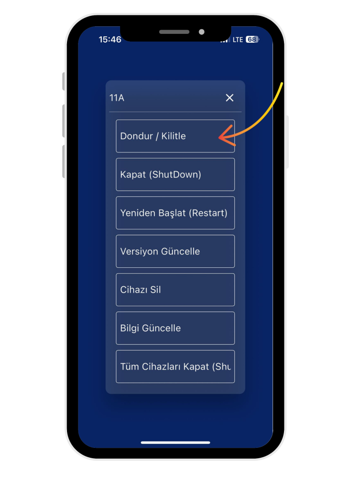 Karşımıza açılan Kumanda ekranında sağ alt kısımda bulunan Ayarlar butonuna basıyoruz. Açılan menüde Cihaz işlemleri butonuna tıklıyoruz. Karşımıza gelen menüden Dondur/Kilitle butonunu seçiyoruz.