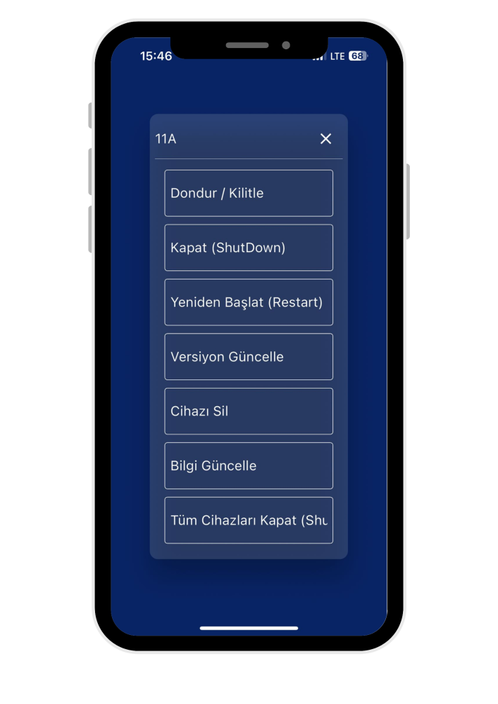 Karşımıza açılan Kumanda ekranında sağ alt kısımda bulunan Ayarlar butonuna basıyoruz. Açılan menüde Cihaz işlemleri butonuna tıklıyoruz. Karşımıza gelen menüden (Dondur/Kilitle – Kapat – Yeniden Başlat – Versiyon Güncelle – Cihazı Sil – Bilgi Güncelle – Tüm Cihazları Kapat) butonlarından hangi işlemi yapmak istiyorsanız o butona tıklayarak işleminizi gerçekleştirebilirsiniz.