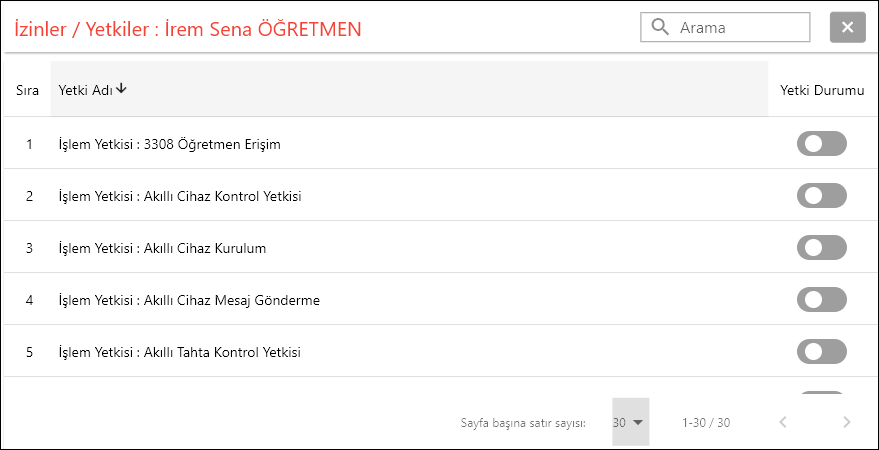 Bu pencereden öğretmenlerin diğer modüllerde dahil olmak üzere kullanabileceği özellikler için yetkilerini görebilir, öğretmenlerinizden yetki alıp verebilirsiniz.