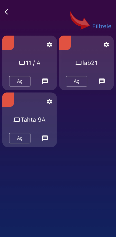 Uygulamak için Akıllı Cihaz Yönetimi modülünden Akıllı Tahta Kontrol alt modülüne giriş yapmalısınız. Akıllı tahta kontrol menüsünün sağ üst tarafında bulunan Filtreleme butonuna tıklayın. Açılan pencereden filtrelemek istediğiniz(görmek istemediğiniz) cihazların üzerinden tik işaretini kaldırmanız, kullandığınız cihazların üzerinde bulunan kutucukları tiklemeniz yeterlidir.