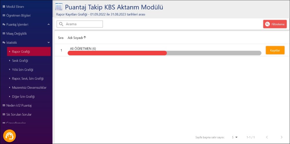 Bu sayfadan öğretmenlerin almış oldukları rapor, izin ve devamsızlık kayıtlarını istatistiksel olarak, Kayıtlar butonu ile detaylı olarak görüntüleyebilirsiniz. Gerekli durumlarda öğretmene Yeni Kayıt Ekle butonundan yeni bir kayıt ekleyebilirsiniz.