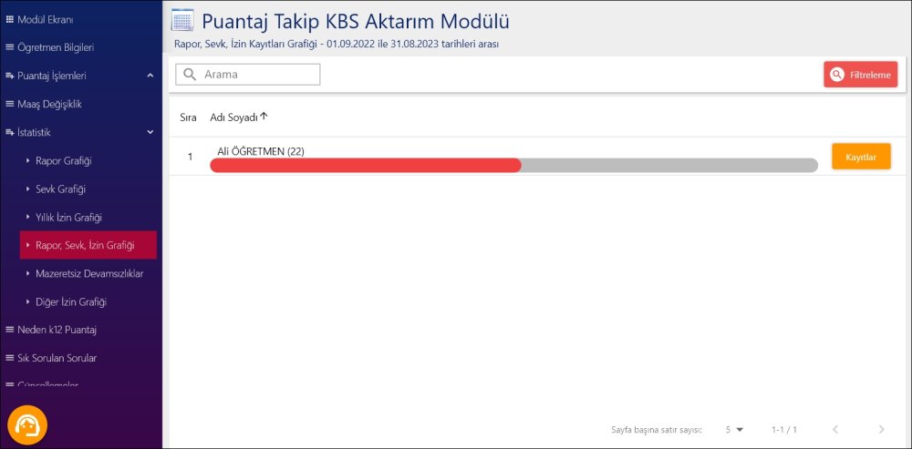 Bu başlık altında öğretmenlerin almış oldukları rapor, izin ve sevk kayıtlarının istatistiksel olarak görünümünden bahsediliyor.
