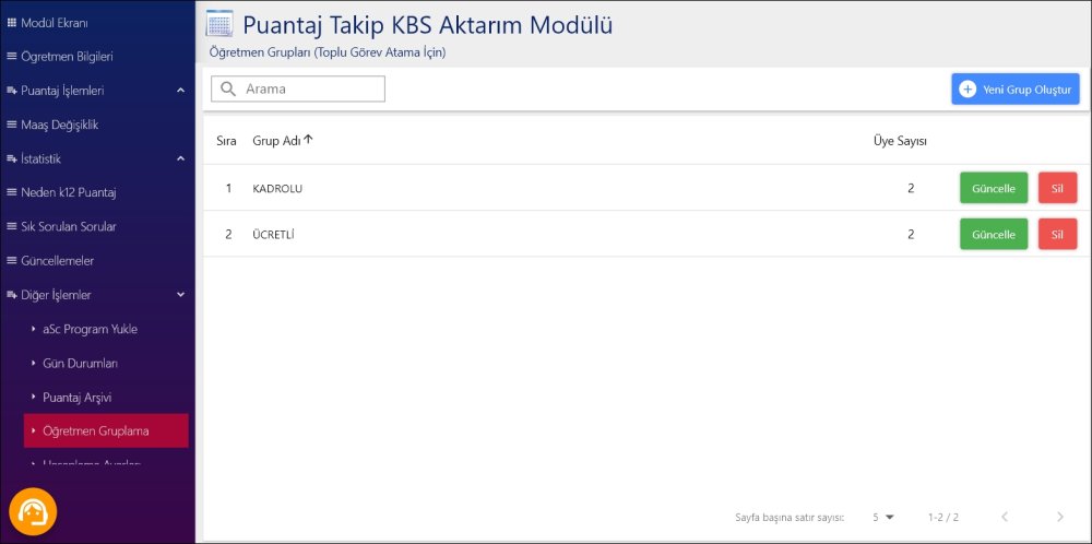 Öncelikle Kadrolu Puantaj Takip KBS Aktarım > Diğer İşlemler > Öğretmen Gruplarına sayfasını açın.