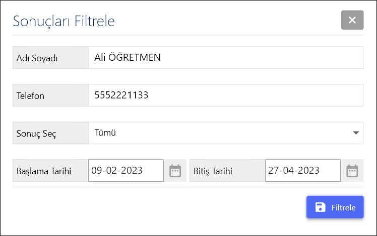 Bu pencereden bulmak istediğiniz mesajı gönderen kişinin Adı Soyadı, Telefon Numarası ve Sonuç bilgisini girerek filtreleyebilir, isterseniz Başlama Tarihi ve Bitiş Tarihi girerek genel bir arama yapabilirsiniz.