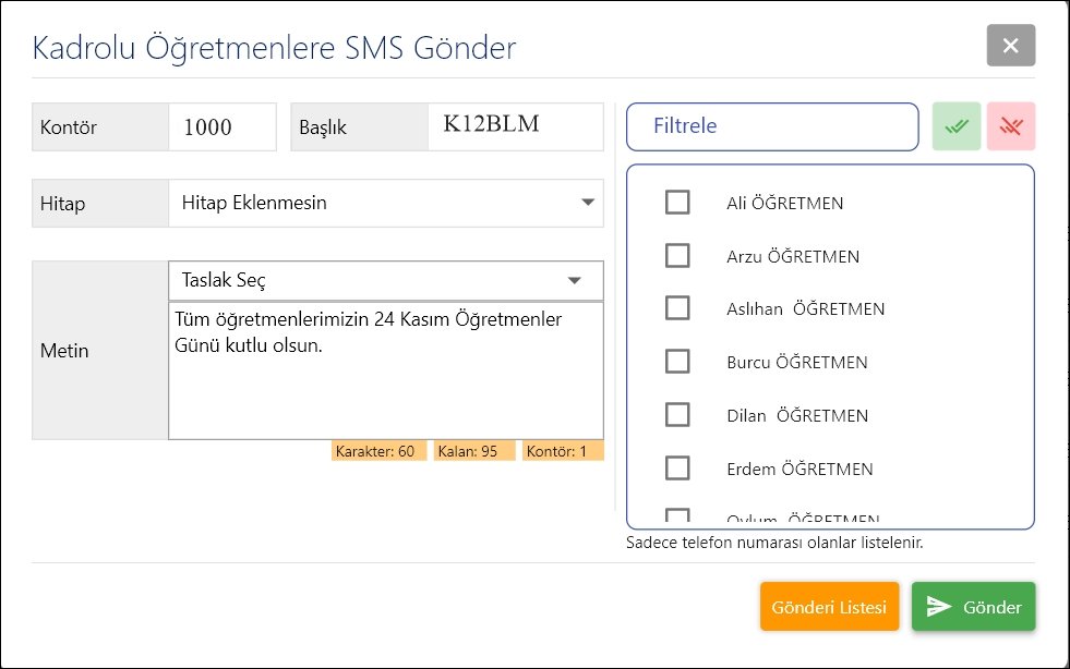 Açılan pencerede hitap ve metin kutucuğunu göndermek istediğiniz mesajı girerek doldurduktan sonra sağ taraftaki öğretmen listesinden SMS göndermek istediğiniz öğretmenler seçebilirsiniz. Bütün öğretmenlere göndermek istiyorsanız öğretmen listesinin üstündeki yeşil tik butonuna tıklayabilirsiniz.