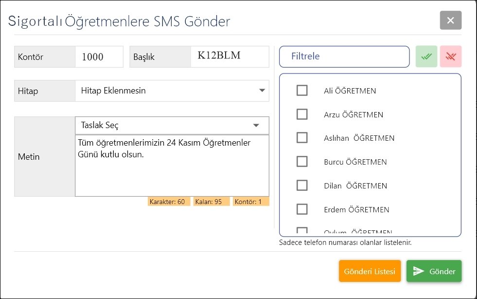 Açılan pencerede hitap ve metin kutucuğunu göndermek istediğiniz mesajı girerek doldurduktan sonra sağ taraftaki öğretmen listesinden SMS göndermek istediğiniz öğretmenler seçebilirsiniz. Bütün öğretmenlere göndermek istiyorsanız öğretmen listesinin üstündeki yeşil tik butonuna tıklayabilirsiniz.