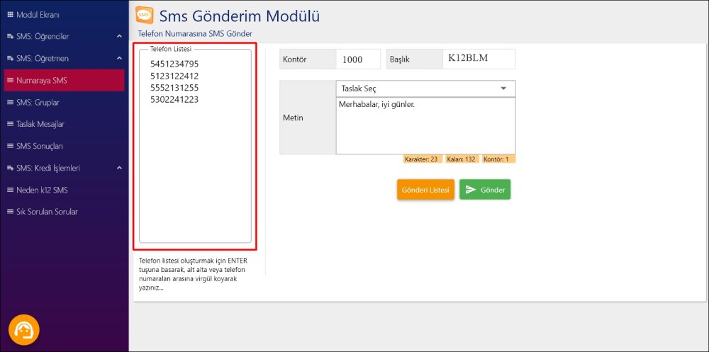 Bu başlık altında telefon numaralarına toplu SMS gönderme ve k12 Web uygulamasında kayıtlı olmayan herhangi bir numaraya nasıl SMS gönderebileceğiniz anlatılmakta.