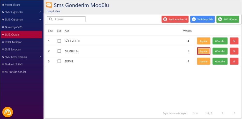 Bu işlemden sonra gruba kişileri eklemek için oluşturduğunuz grubun Kayıtlar butonuna tıklayın.