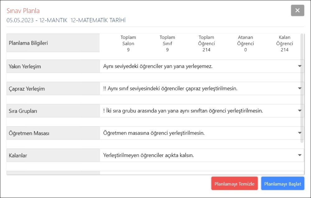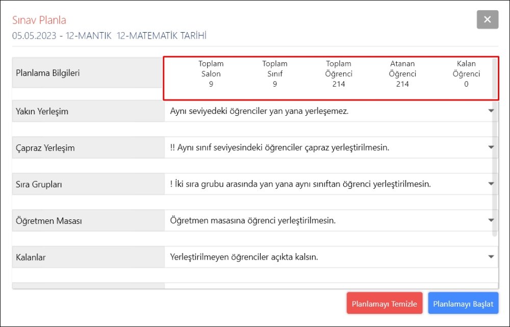Planlama Bilgileri bölümünden sınavda kullanılan salon sayısı, teste girecek sınıf sayısı ve toplam öğrenci sayısını görebilirsiniz. Atanan Öğrenci sayısı planlama başlatılmadan önce yerleşimi belirlenmemiş öğrenci sayısını göstermektedir.