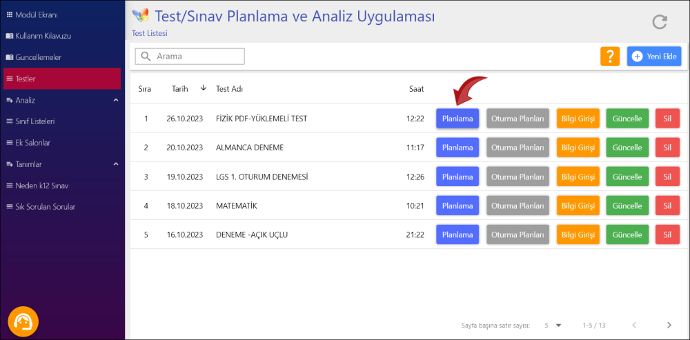 Öncelikle Test/Sınav Planlama Ve Analiz Uygulaması modülünde Testler sayfasını açalım.