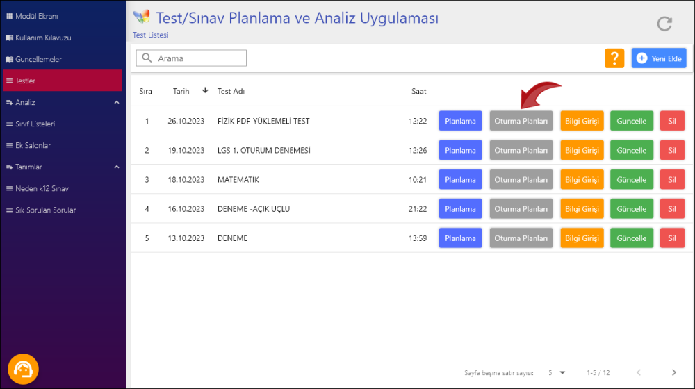 Planlama işlemi tamamlandıktan sonra öğrencilerin salon dağılımlarını görmek için Oturma Planları butonuna tıklayın.