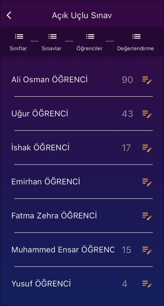 Test/Sınav seçildikten sonra karşınıza seçtiğiniz sınıfta bulunan öğrencilerin listesi açılacak. Bu listeden daha önce bu test/sınav için puan almış öğrencileri görebilir, yeni puanlama yapmak için öğrencinin yanında bulunan butona tıklamalısınız.