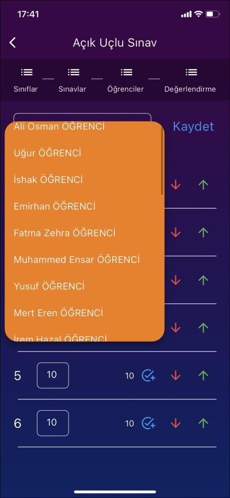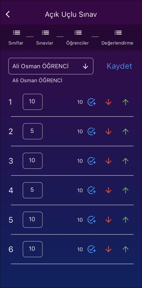Öğrencinin puanlama işlemi tamamlandıktan sonra yukarıda bulunan açılır menüden diğer öğrencilere puanlama yapabilirsiniz.