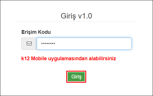 Erişim Kodunu girmek için yine aynı şekilde sağ üst köşeden k12 – Veri Okuma uzantısını açın. Kopyalamış olduğunuz kodu boş alana yapıştırıp Giriş butonuna tıklayın.