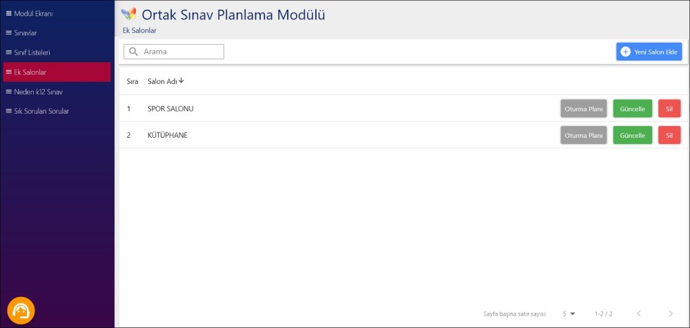 Öncelikle Sınav Planlama İstatistik Ve Analiz Uygulaması modülünde Ek Salonlar sayfasını açalım. Bu sayfada varsa daha önce oluşturduğunuz Ek Salonları veya sağ üst tarafta bulunan Yeni Salon Ekle butonundan oluşturacağınız yeni salonları görebilirsiniz.
