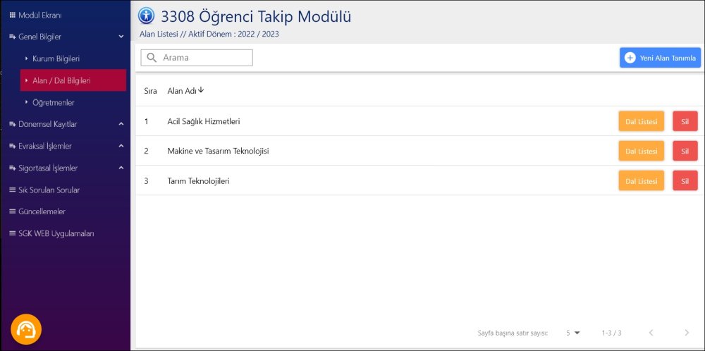 Öncelikle 3308 Öğrenci Takip Uygulaması > Genel Bilgiler > Alan / Dal Bilgileri sayfasını açın.
