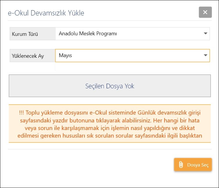 Dosya Seç butonundan Excel(sadece veri) olarak indirip Metin Sekme İle Ayrılmış olarak kayıt etmiş olduğunuz (OOK08001R060) ayrıntılı devamsızlık dosyasını seçip yükleyin.