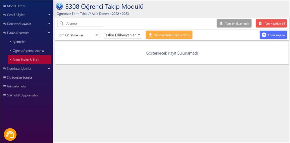 Öncelikle 3308 Öğrenci Takip Uygulaması > Evraksal İşlemler > Form Teslim & Takip sayfasını açın.