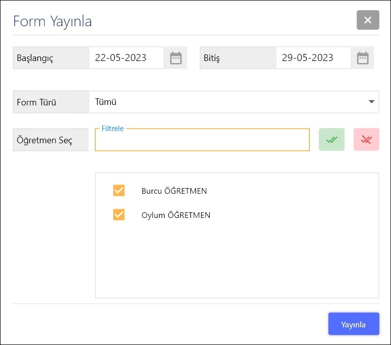 Form Yayınla penceresinden başlangıç, bitiş tarihi, form türünü ve yayınlanacak öğretmenleri seçtikten sonra Yayınla butonu ile işlemi tamamlayabilirsiniz.