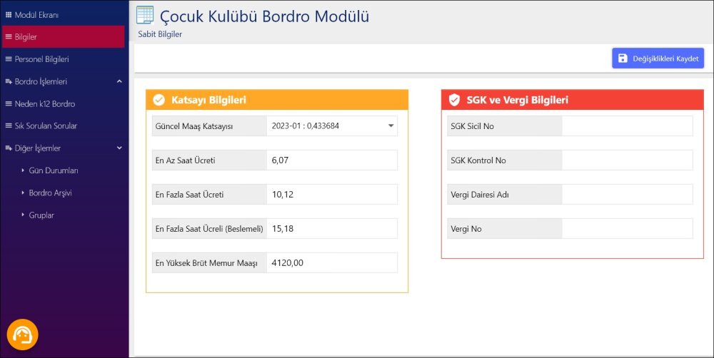 Öncelikle Çocuk Kulübü Bordro Uygulaması > Bilgiler sayfasını açın.