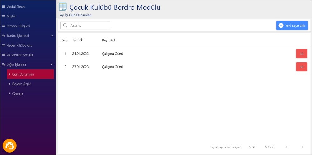 Öncelikle Çocuk Kulübü Bordro Uygulaması > Diğer İşlemler > Gün Durumları sayfasını açın.